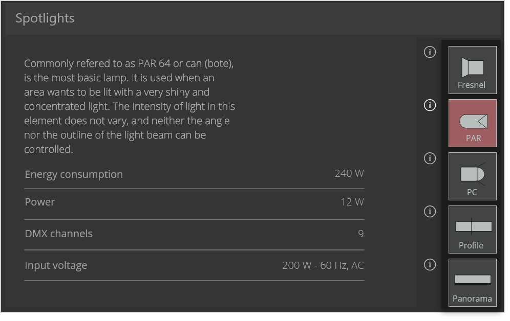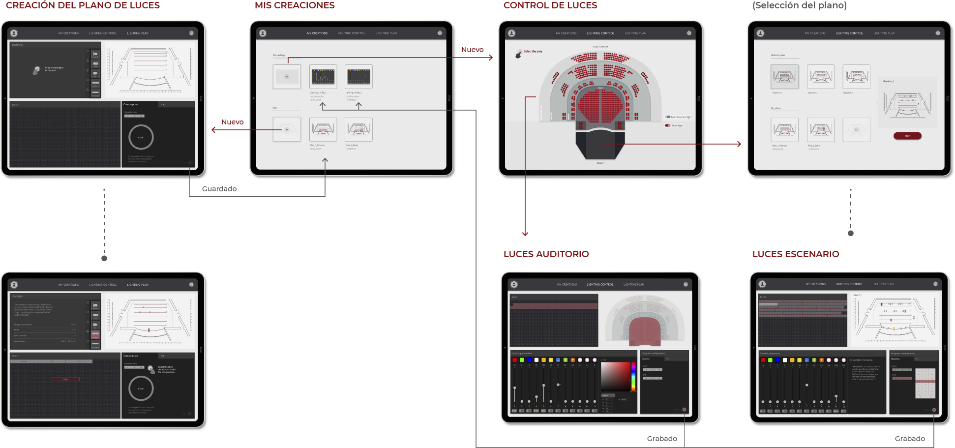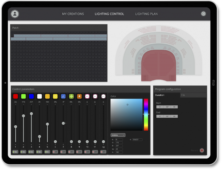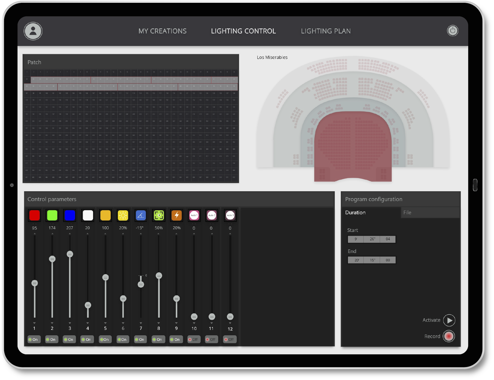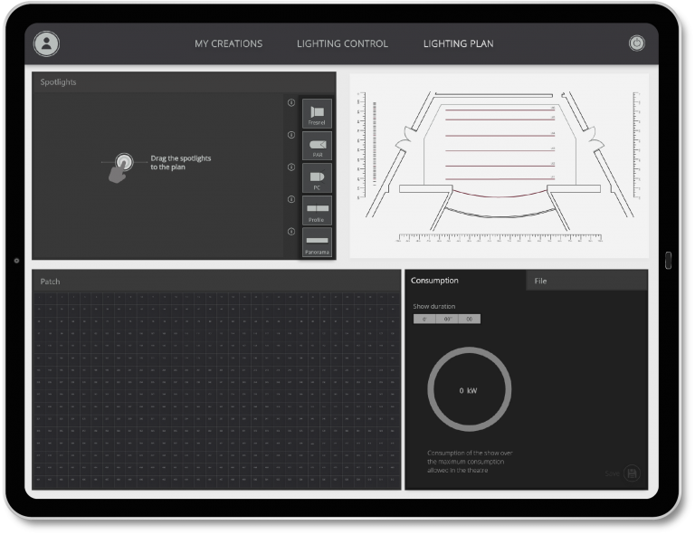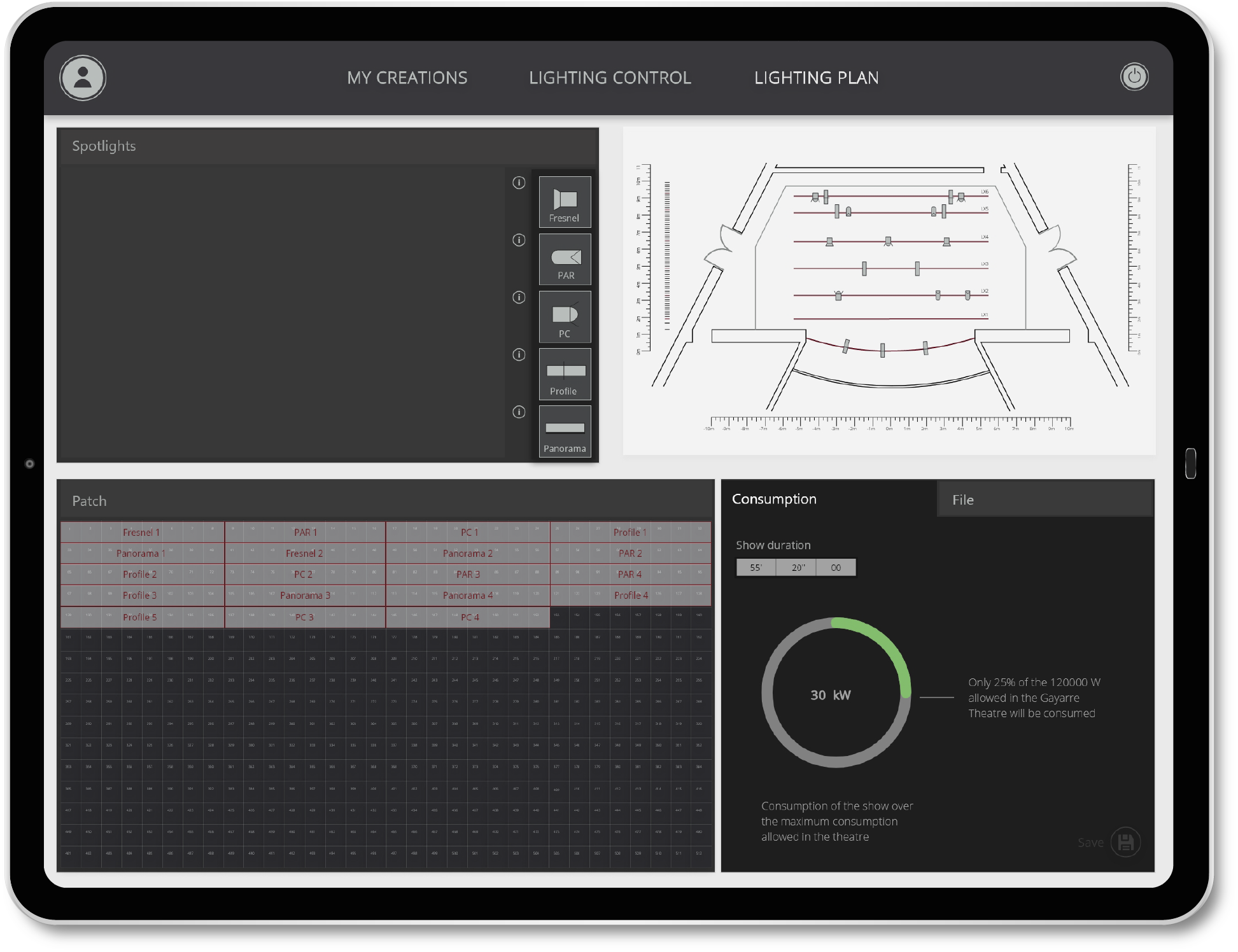 Una aplicación para experimentar el rol de técnico de iluminación mediante el diseño digital de planos de luces, la modificación de los focos, la asignación de posiciones y canales y la grabación de sus configuraciones para controlar las luces remotamente y obtener un consumo aproximado del show.